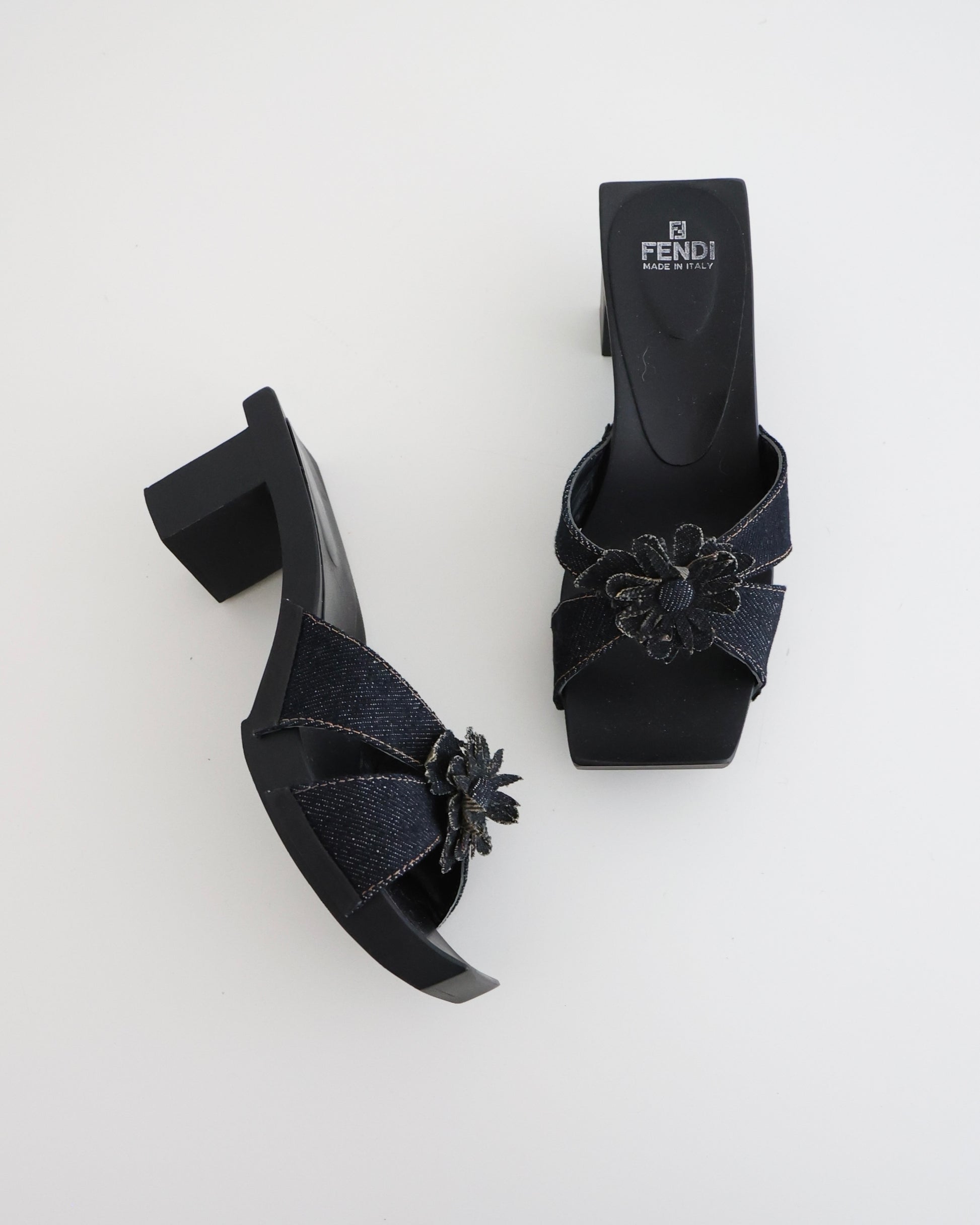 Fendi dark navy denim open toe heels with flowers. Shoes have a square toe and chunky block heel.