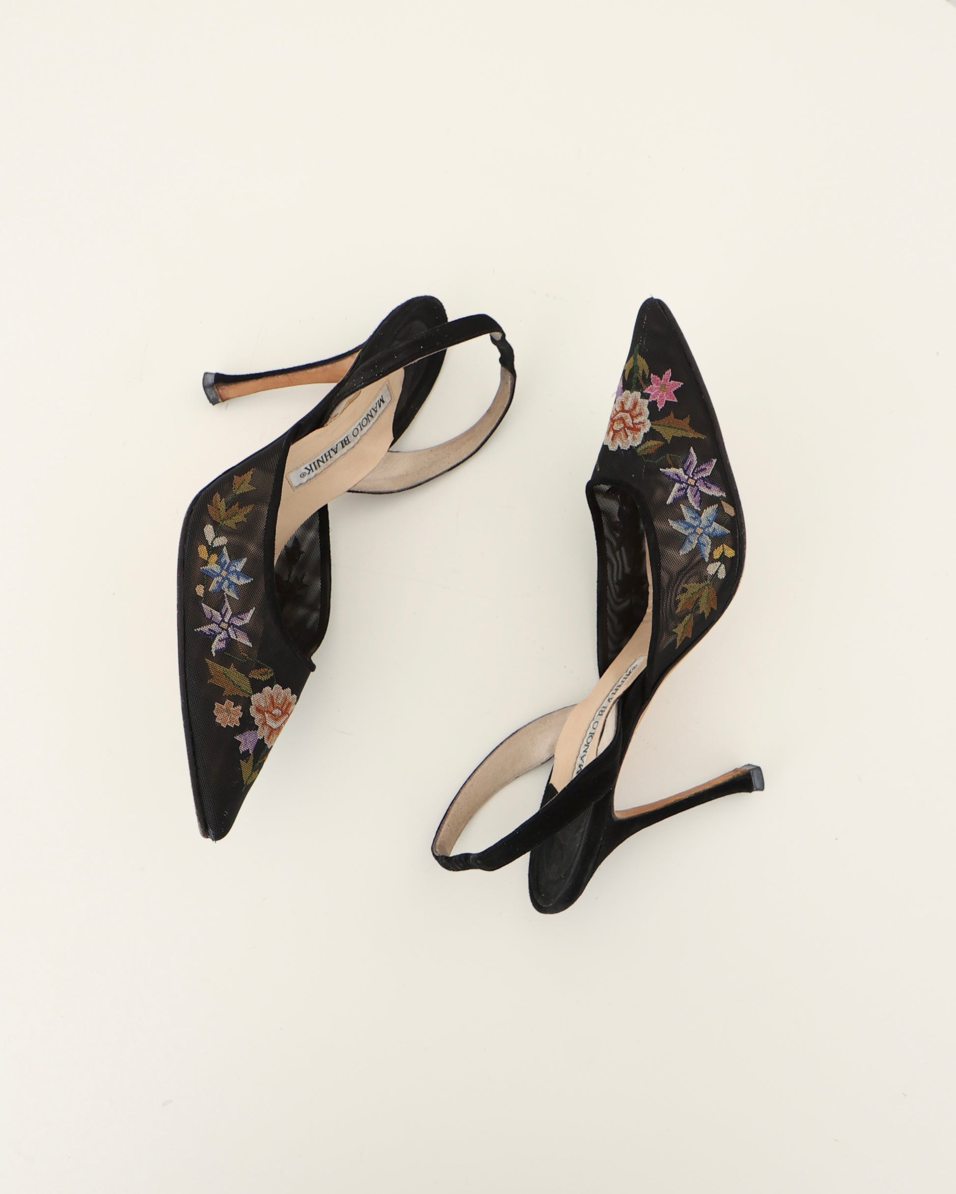 Vintage Manolo Blahnik sheer black pointed toe slingback heels with printed floral accents.