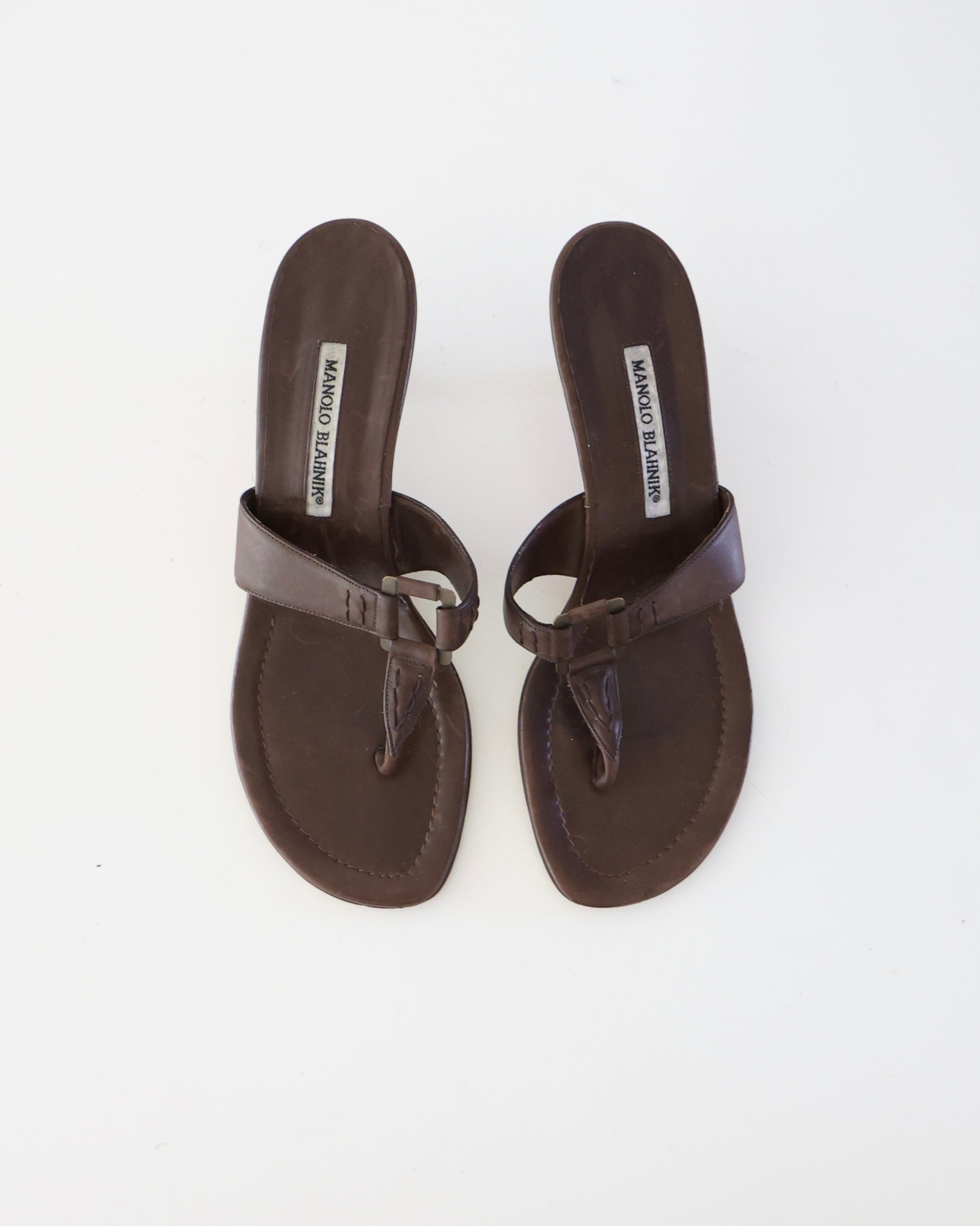 Vintage Manolo Blahnik brown leather open toe heels with square accents.