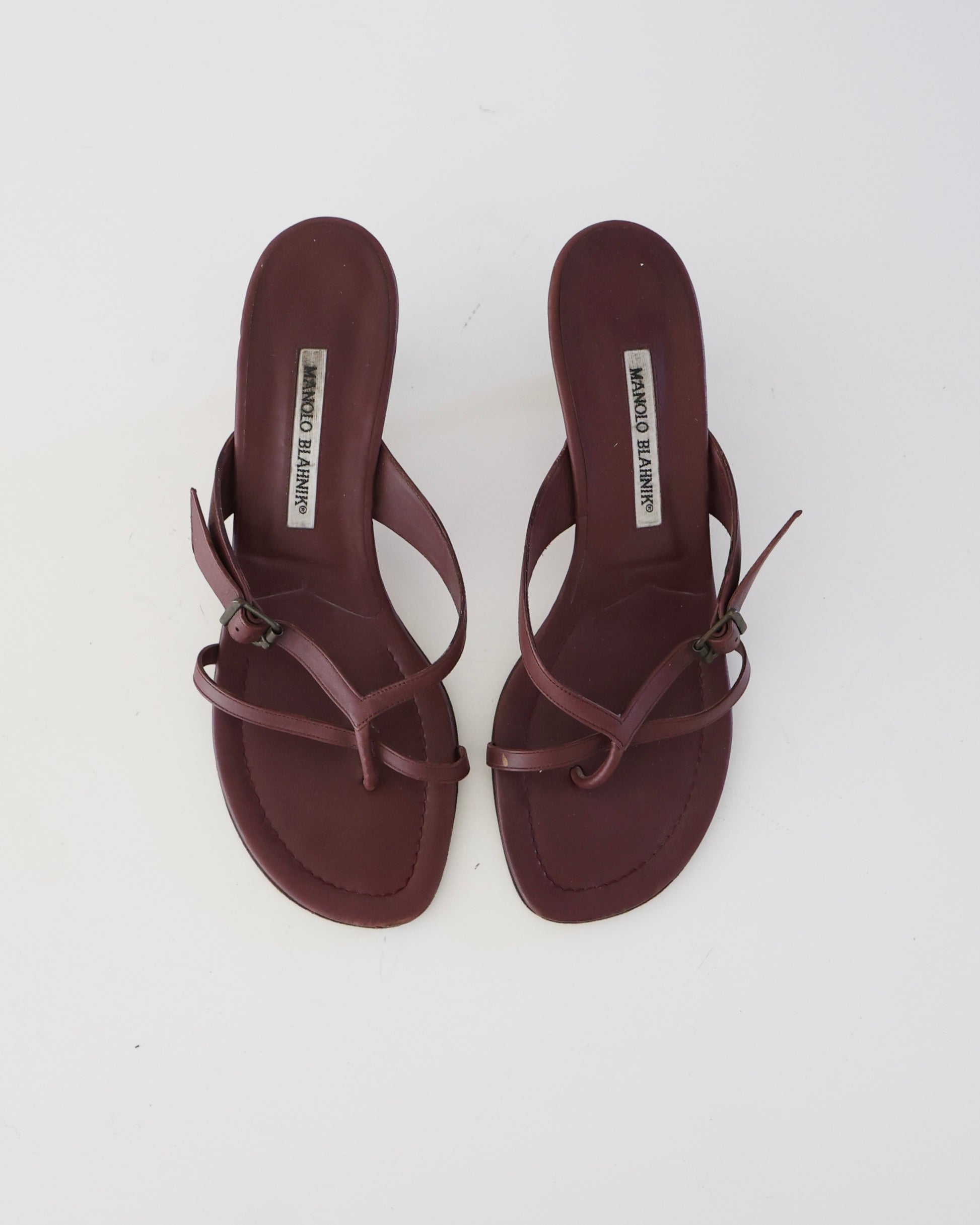 Vintage Manolo Blahnik burgundy leather open toe heels with buckle accents.