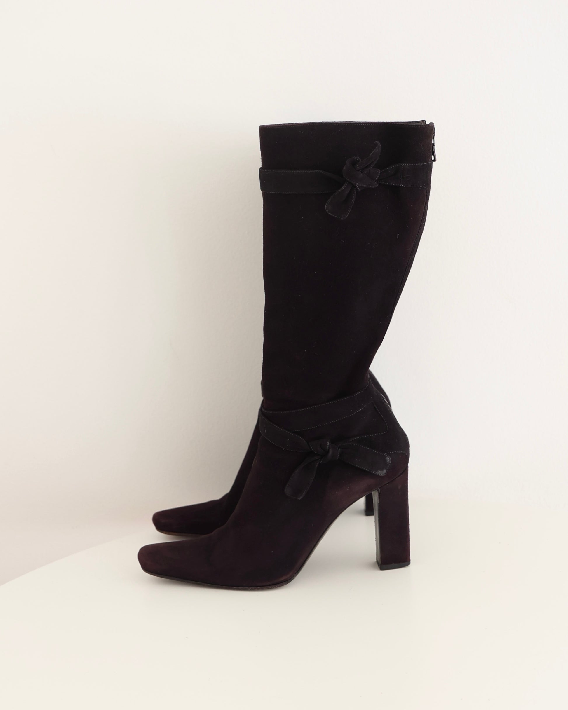 Vintage Prada dark brown suede knee high boots ties around the ankles and calves.