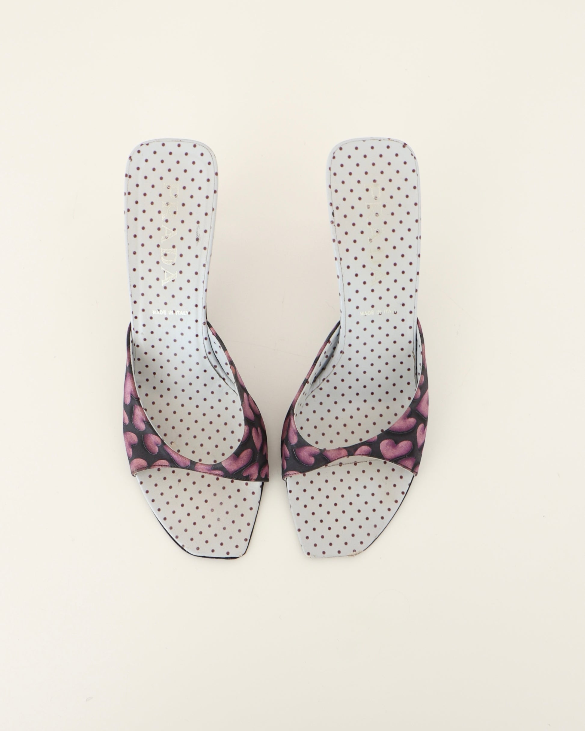 Vintage Prada fabric graphic purple heart heels with open toes and polka dot soles.