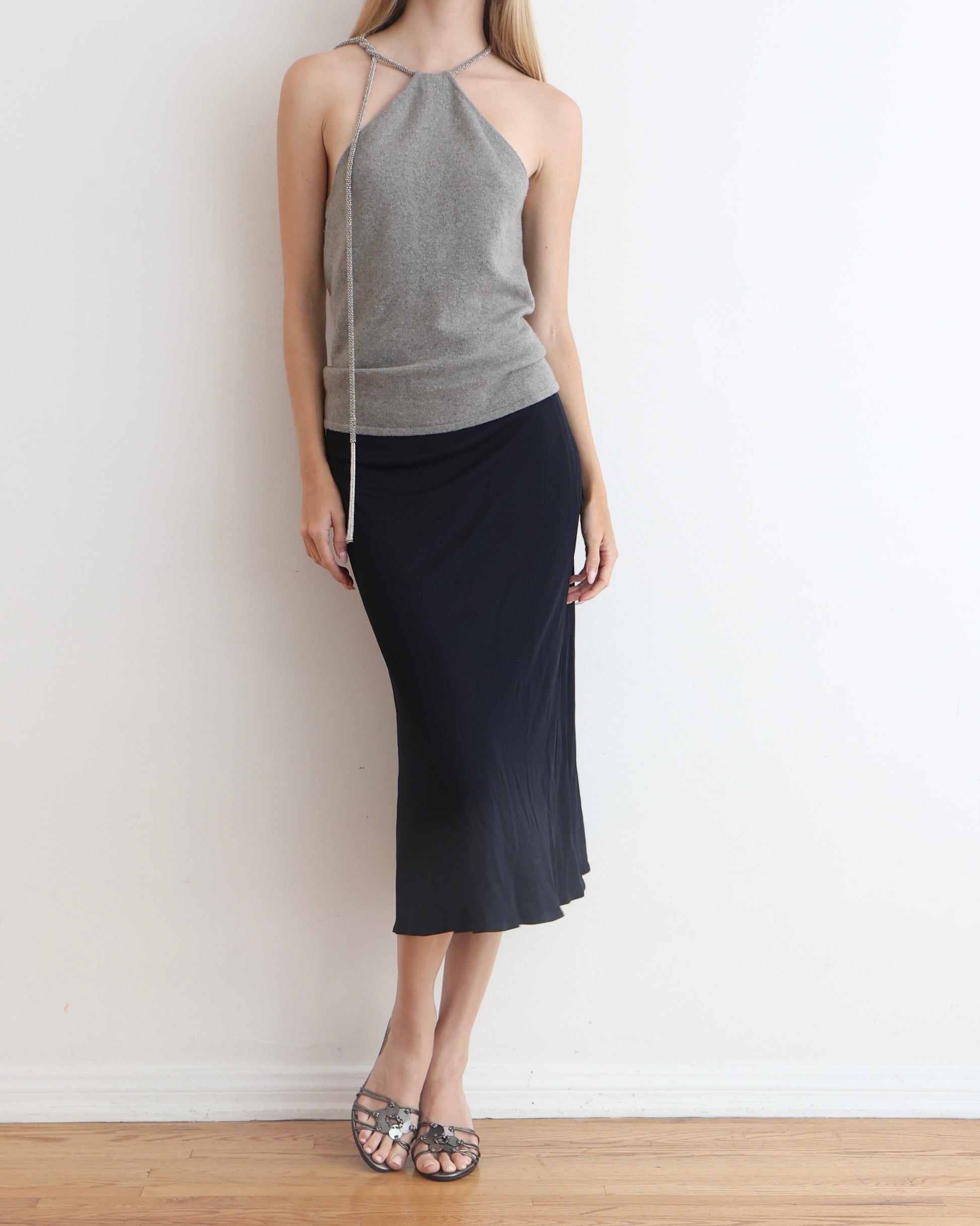 Vintage Ralph Lauren gray knit halter top with a silver tassel tie
